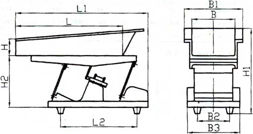 電磁振動(dòng)給料機(jī)的振幅和給料量受料倉(cāng)倉(cāng)壓影響較大,設(shè)計(jì)料倉(cāng)時(shí)應(yīng)盡量減少倉(cāng)壓,使溜咀后側(cè)板承受一定的倉(cāng)壓,并設(shè)置斜溜沮及下料閘門。如圖,一般a=1/4b。溜咀四周應(yīng)與給料槽留有一定的間隙,一般5~10mm,以免產(chǎn)生噪音及影響振動(dòng)。